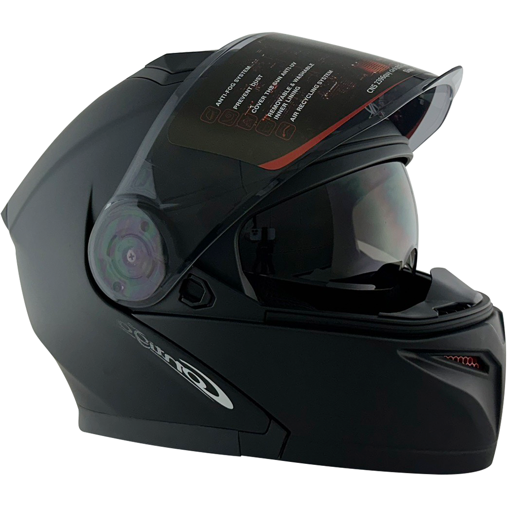 4.雙鏡片設計,戴上帽的左側,撥動開關,向上撥動到底可將內墨鏡片拉出,向下即可收藏起來。